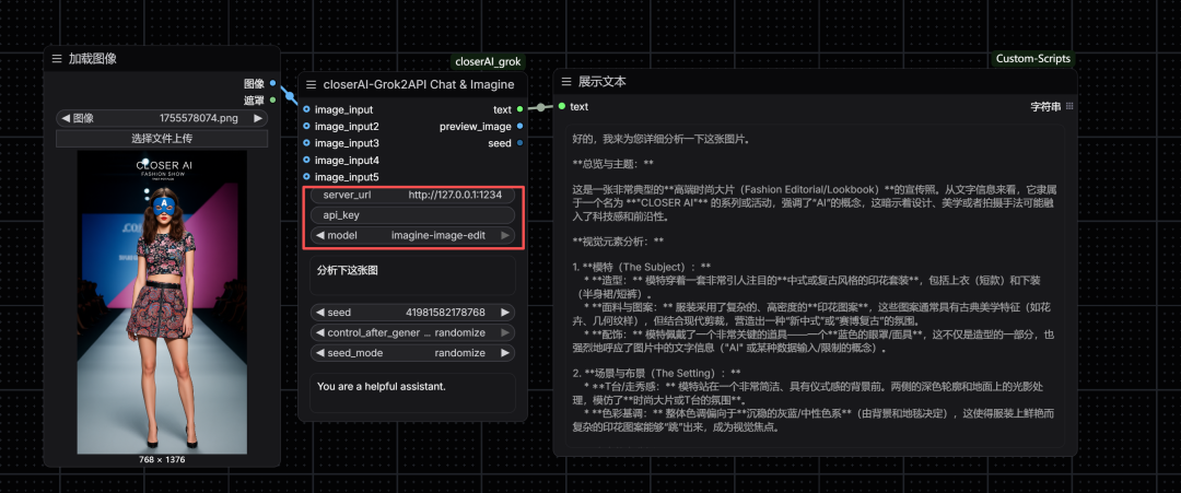 然后在comfyUI中。使用我之前开发的closerAI-grok节点。填一下URL就行,API KEY和模型名称都不需要填就能调用了,如下图所示: