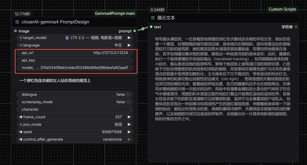专门为LTX2.3、flux、wan2.2等提供提示词优化的。如下图所示,使用上也是简单填写下API信息。就能本地调用gemma4来进行使用。